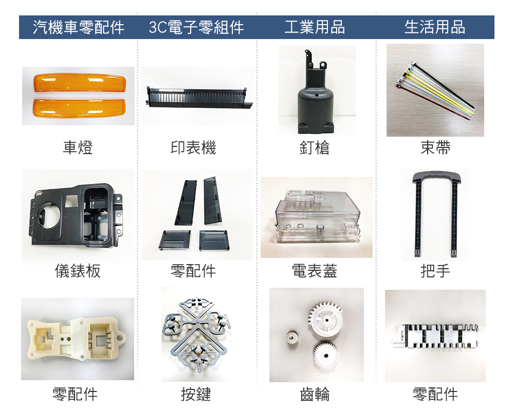 使用材料 PC 、PMMA 、 ABS 、AS 、PBT 、PA66 、PA6 、PP 、PPSU、POM 、PVDF 、PPS 、TPU 、TPR …