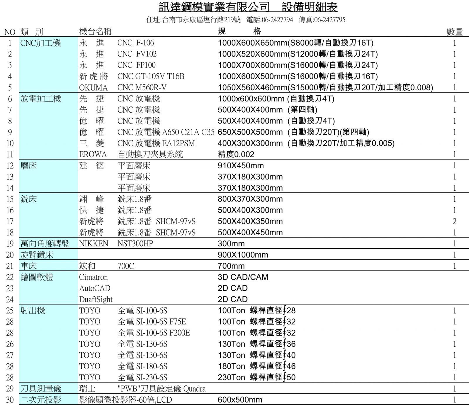 設備明細表 Equipment List